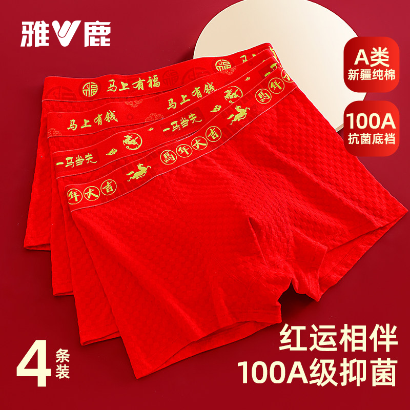 雅鹿男士内裤纯棉抗菌平角裤青少年男款本命年红色全棉四角短裤头