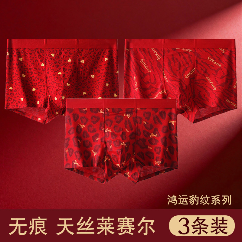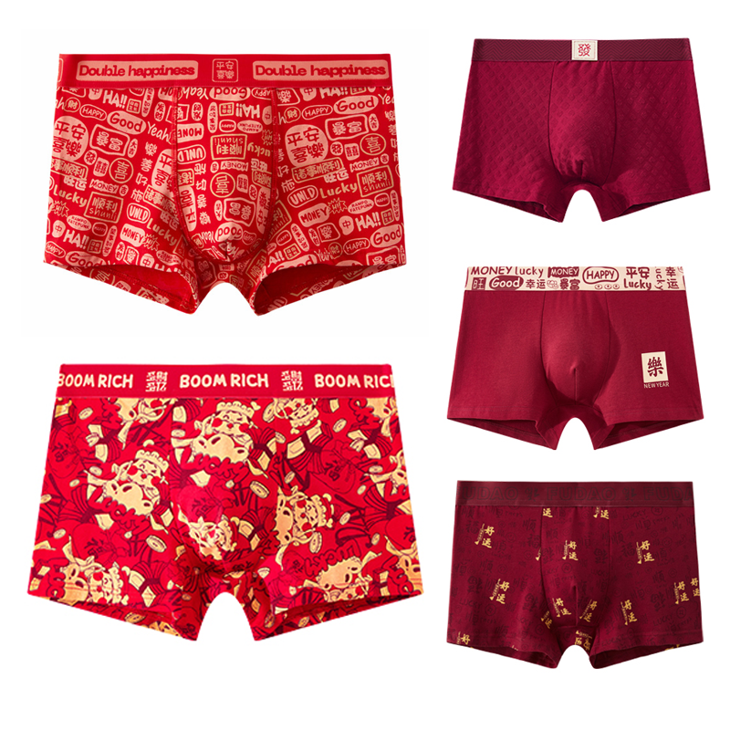 本命年男士平角内裤无痕舒适透气抑菌印花青年大码平角裤红色结婚