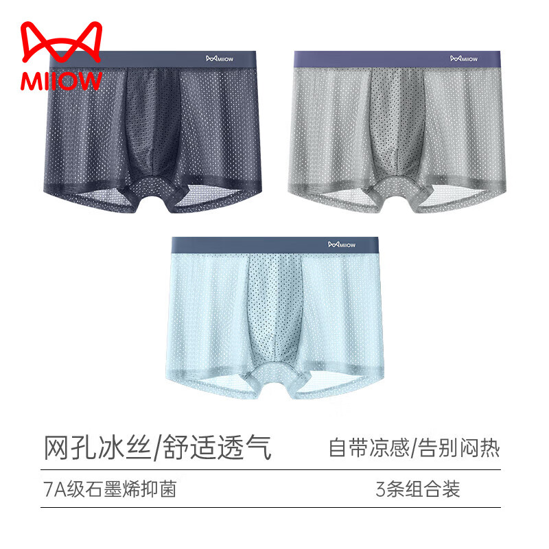 猫人冰丝男士内裤无痕夏季2025新款透气抗菌裆大码四角平角短裤头薄款 深灰+天蓝+浅灰 3条 2XL 【建议120-140斤】
