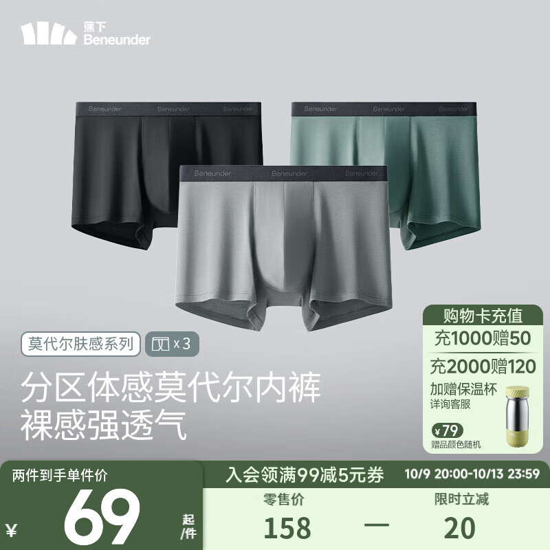 蕉下(beneunder)莫代尔男士内裤3条装无痕底裆抗菌冰丝平角裤透气运动四角裤 月凝灰+漫暮黑+灰榄绿 3条 M