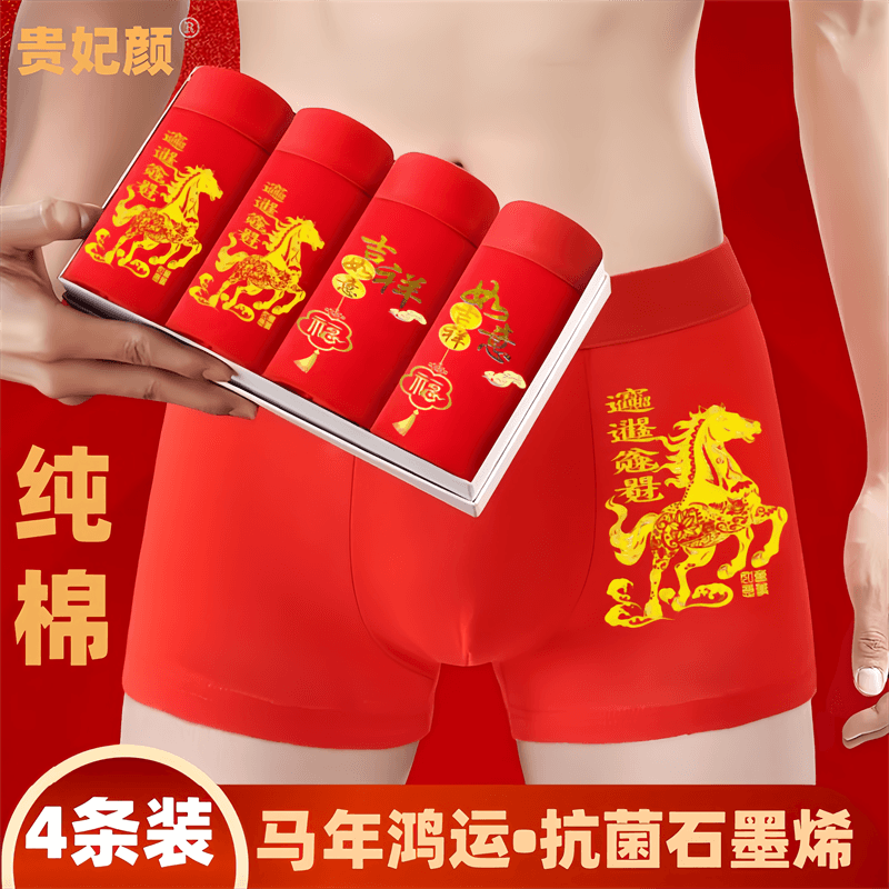 本命年男士纯棉内裤大红男生纯棉属马年结婚大红纯棉四角男生裤头
