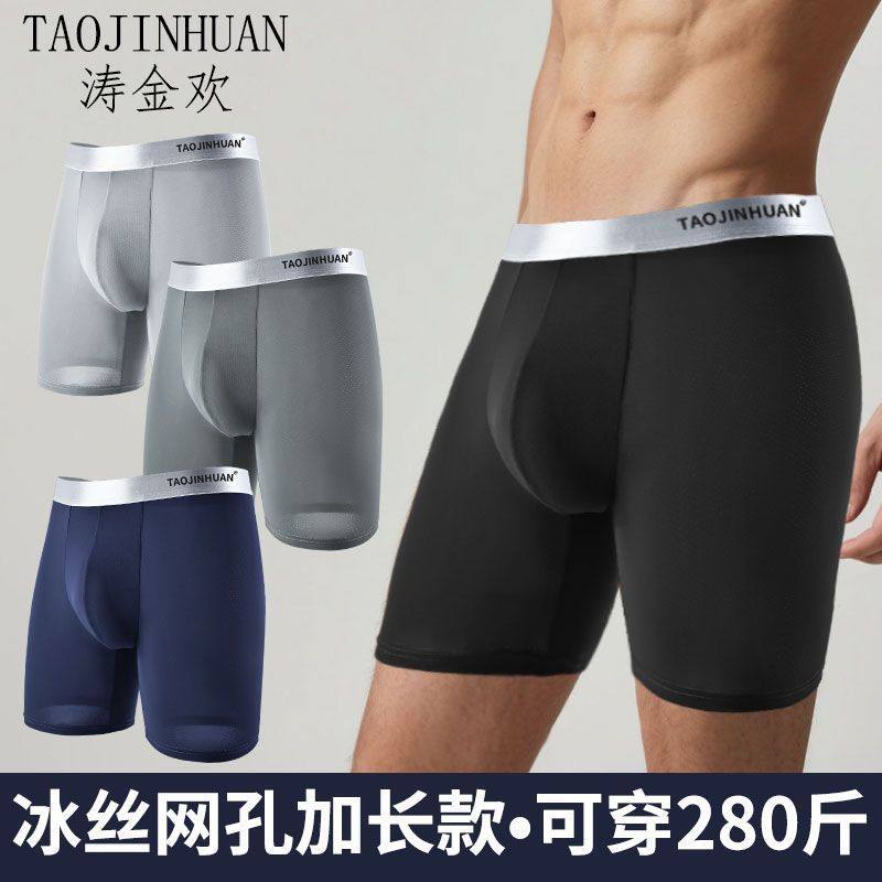 涛金欢男士内裤加长平角裤仿磨腿冰丝高弹双层前档低腰纯色四角裤