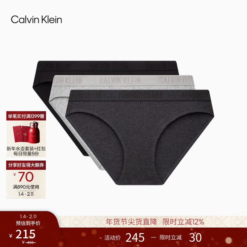 Calvin Klein内衣【新年礼物】女士本命年三条装提花ck棉质比基尼三角内裤女 0P6-太空黑/椰青灰/英雄灰 3条 M