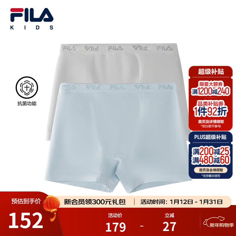 FILA【抗菌功能】斐乐儿童内裤2026春季新款男中大童平角裤2件装 冰体灰/艾丽斯蓝-99 150