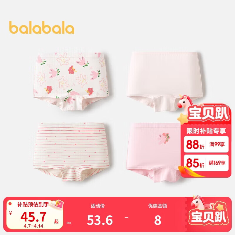 巴拉巴拉童装儿童内裤平角四角短裤女童大童防走光宝宝四条装亲肤舒适可爱