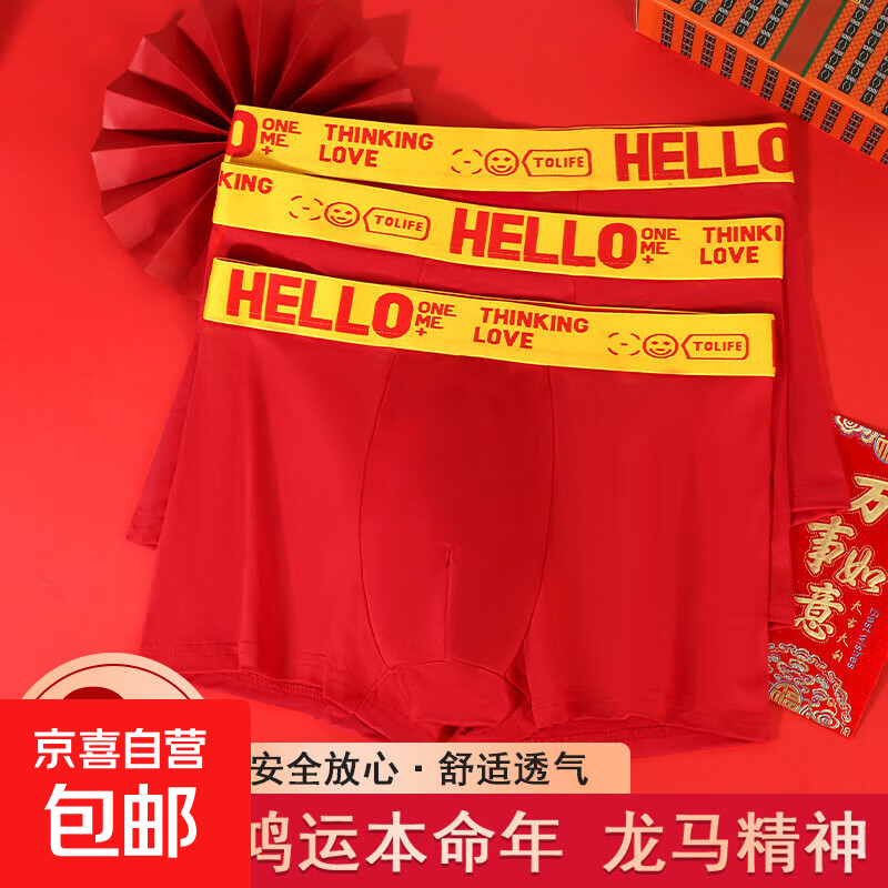宜而爽男士内裤男红色属蛇本命年属龙属狗四角裤衩大红色结婚平角短 【4条袋装】红色 XL