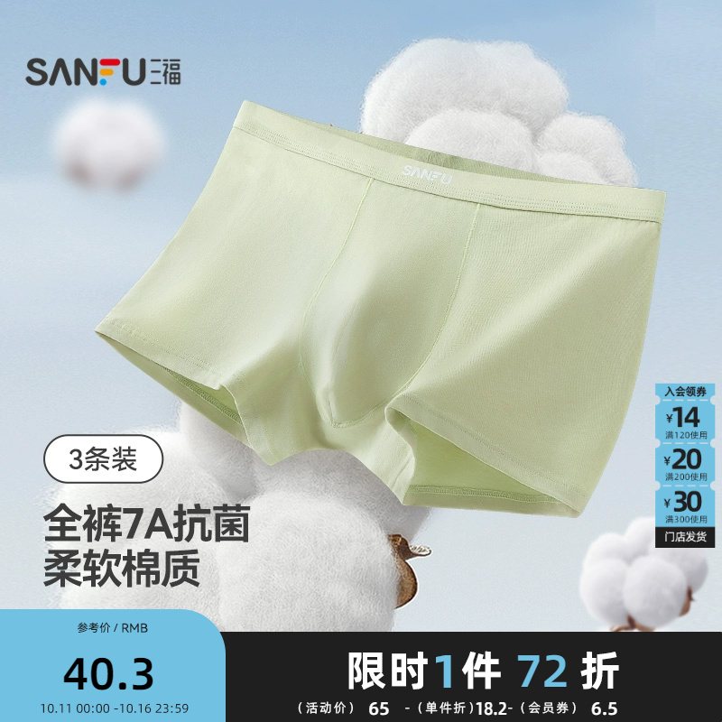 【3条装】三福内裤新款抗菌纯棉U裆透气舒适四角裤平角裤男486723