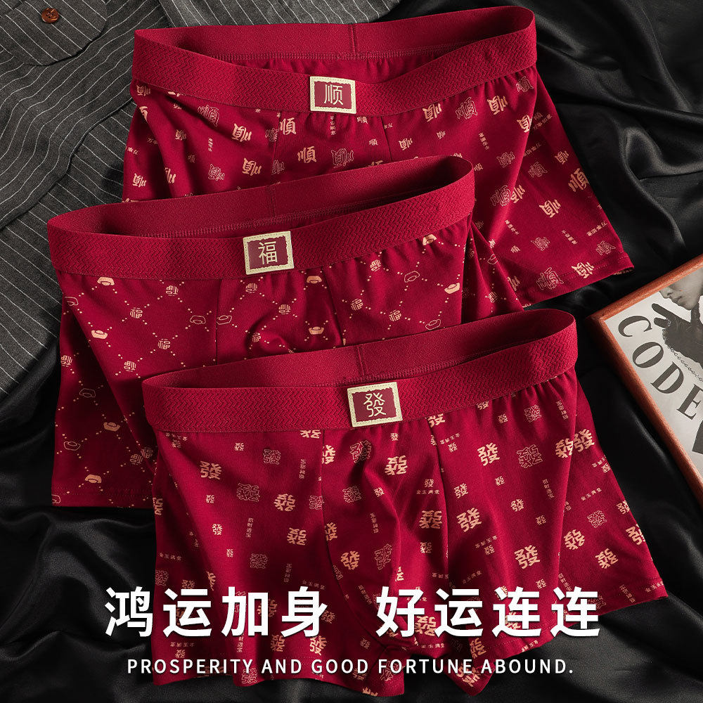 新款印花纯棉男士内裤本命年红色喜庆平角裤舒适透气中腰四角裤衩