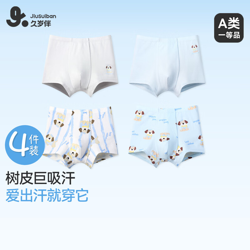 久岁伴儿童内裤男童平角裤A类优可丝3-6岁中小童7A抑菌蚕丝底档四角短裤 4条装【7A抑菌】 130