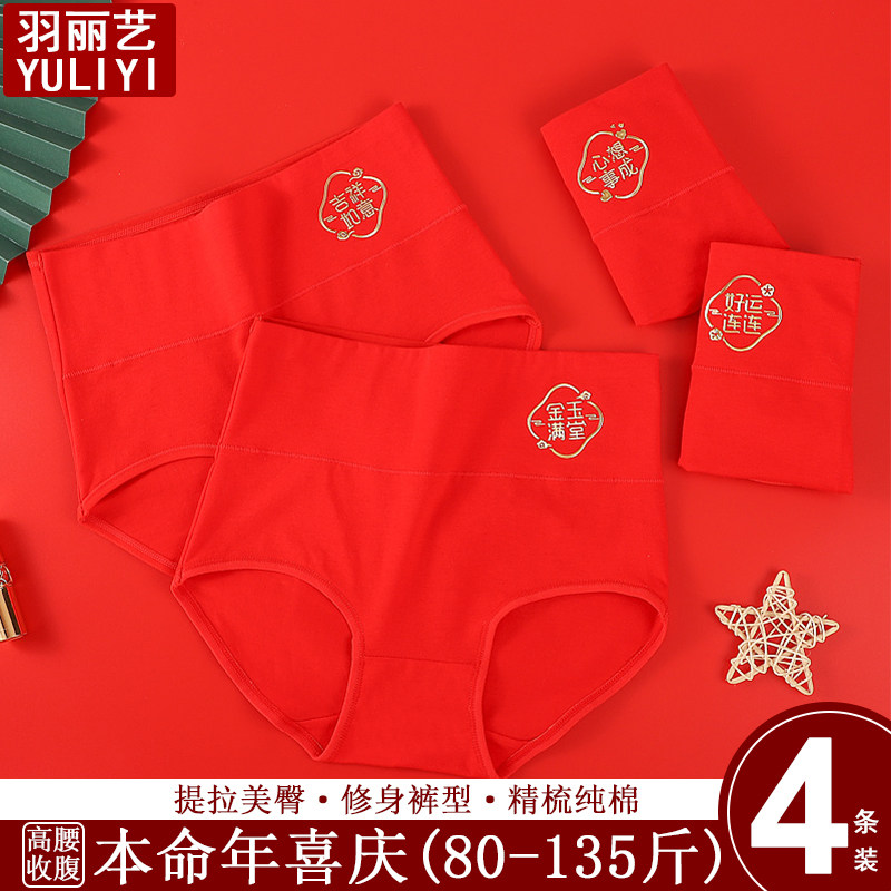 四条装纯棉高腰收腹舒适包臀内裤女士本命年喜庆大红亲肤透气棉裆