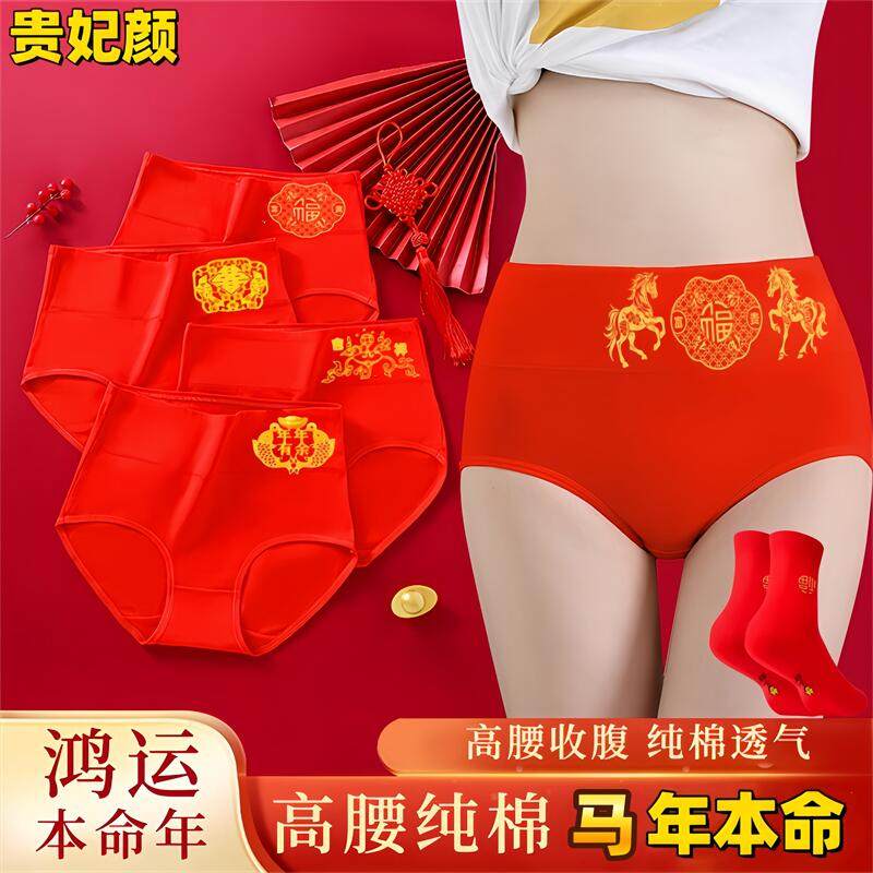 属马本命年高腰纯棉女内裤抗菌收腹提臀马年结婚红内裤大码三角裤