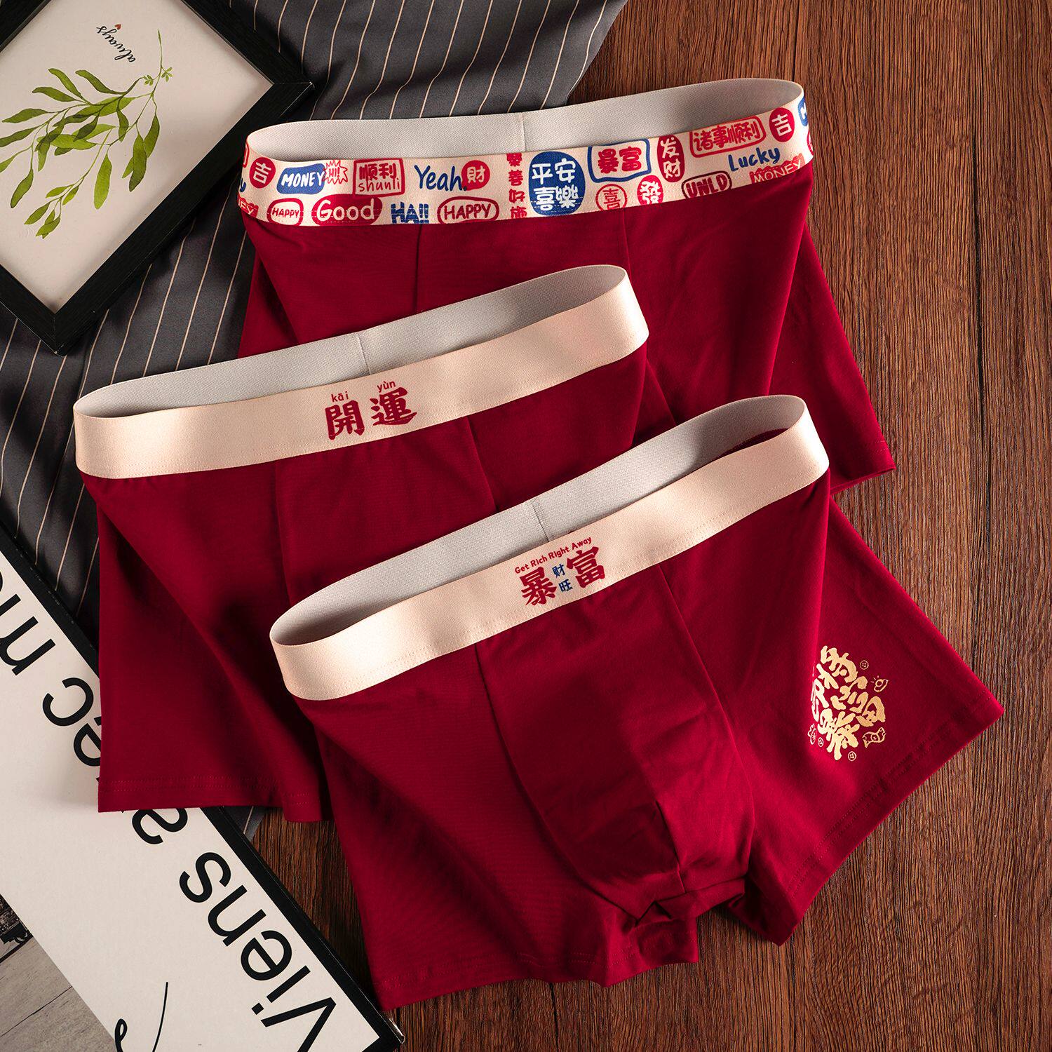 本命年马年男士内裤纯棉中腰平角青年结婚透气四角男生酒红色底裤