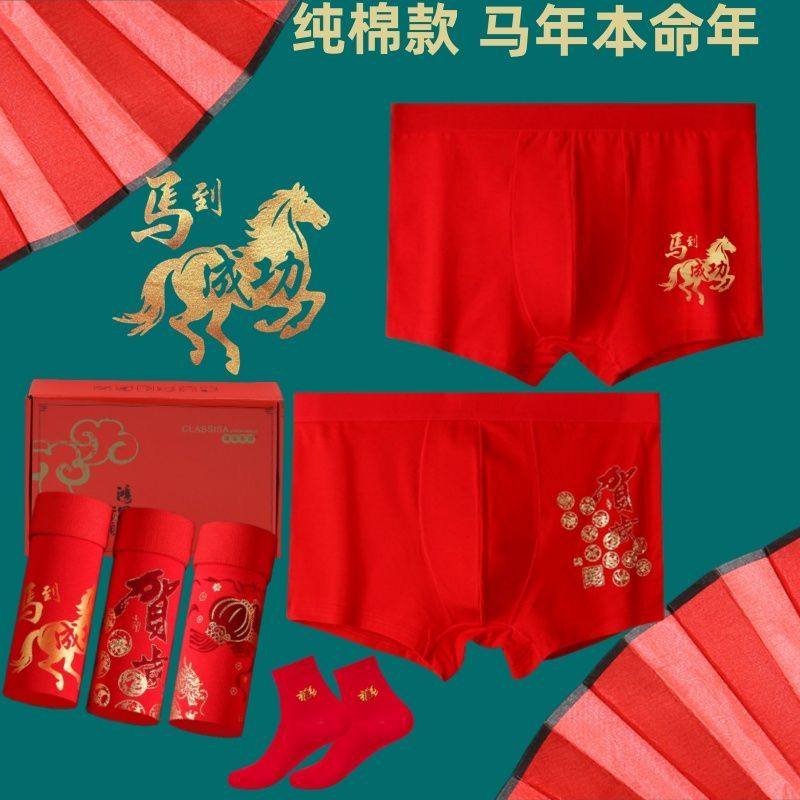 本命年红色男士内裤纯棉平角裤透气好运新年结婚马年四角短裤男款