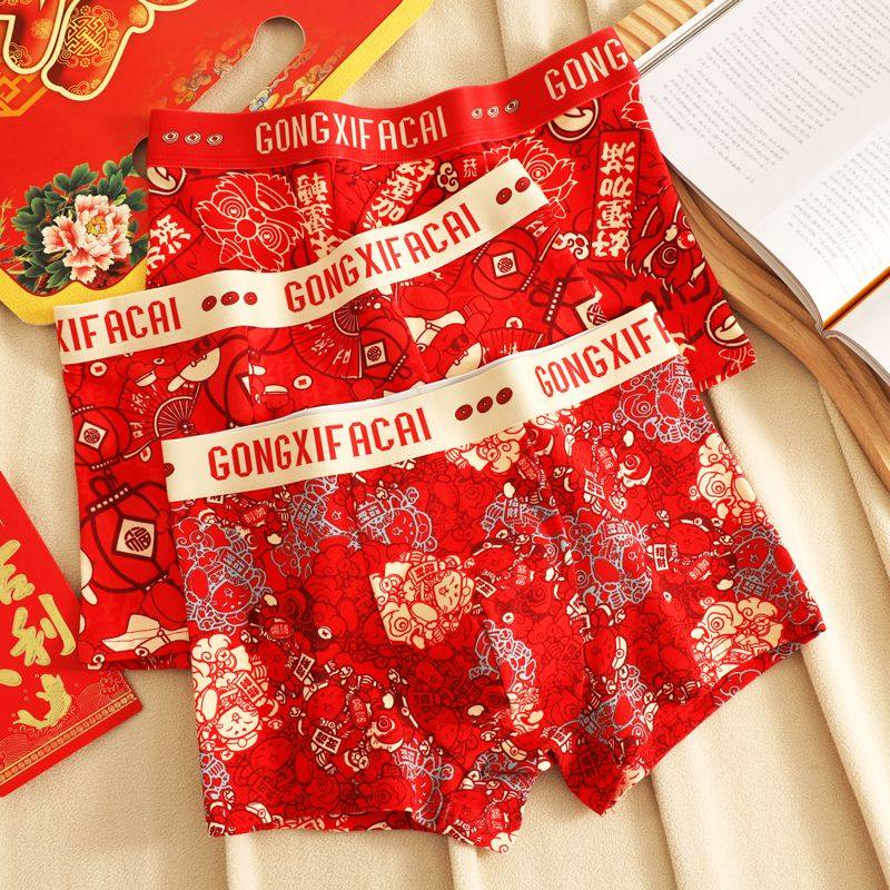 大红纯棉男士内裤四角裤秋冬款印花新年新款时尚本命年大红平角裤