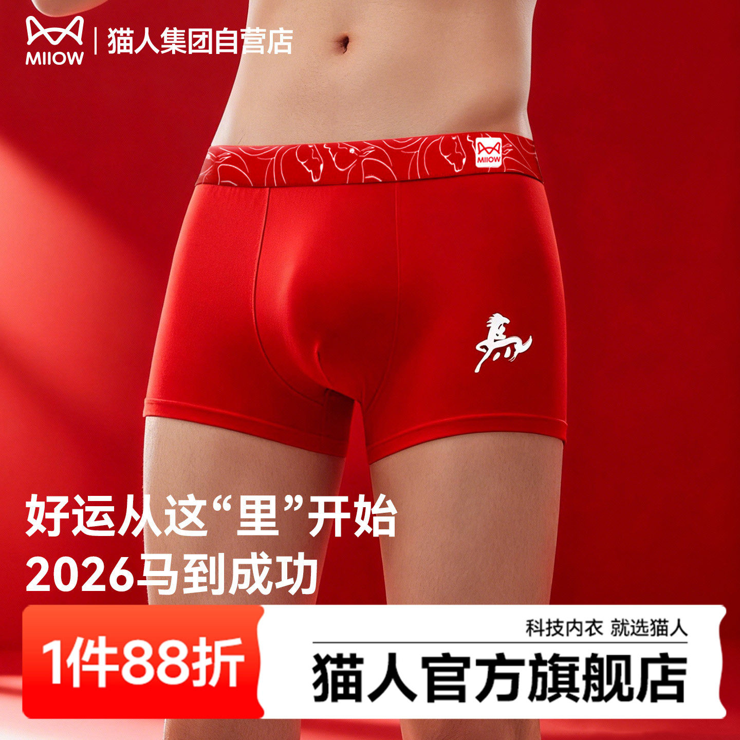 猫人2026新款红色平角内裤男本命年好运四角裤精梳棉抗菌透气裤头