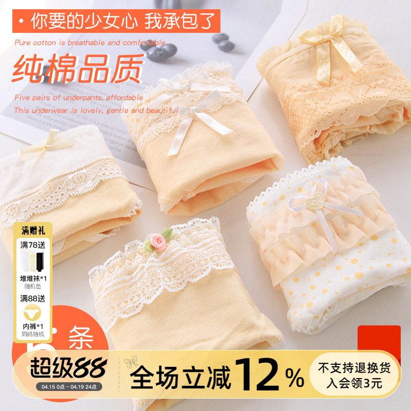 5条纯棉内裤少女蕾丝边日系可爱蝴蝶结全棉裆中腰大码女士三角裤