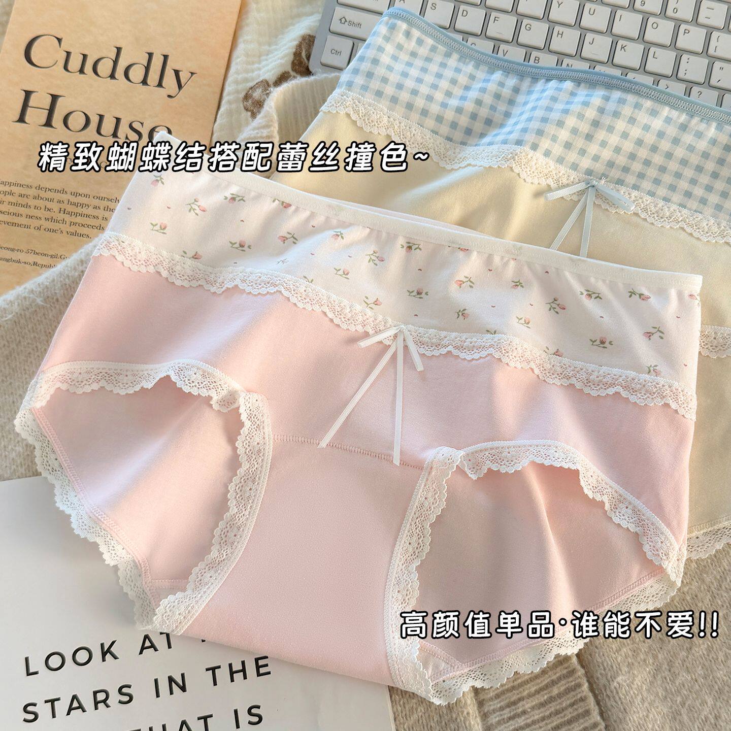 欧若风纯欲蕾丝纯棉内裤女中腰全棉加长裆10A抗菌舒适性感三角裤