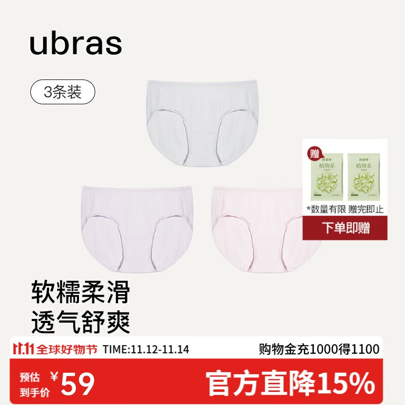ubras高弹织带莫代尔7A抗菌裆中腰三角裤女士内裤女3条装灰+粉+紫M