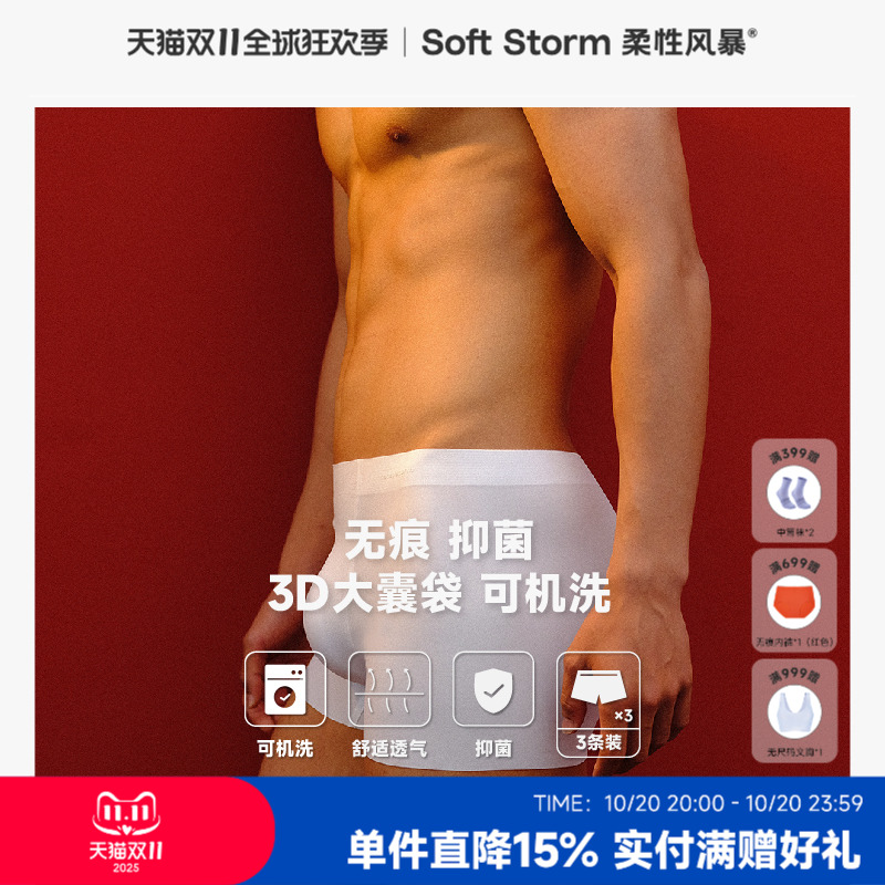 柔性风暴 男士无痕大囊袋平角内裤中腰抗菌透气四角短裤头3件