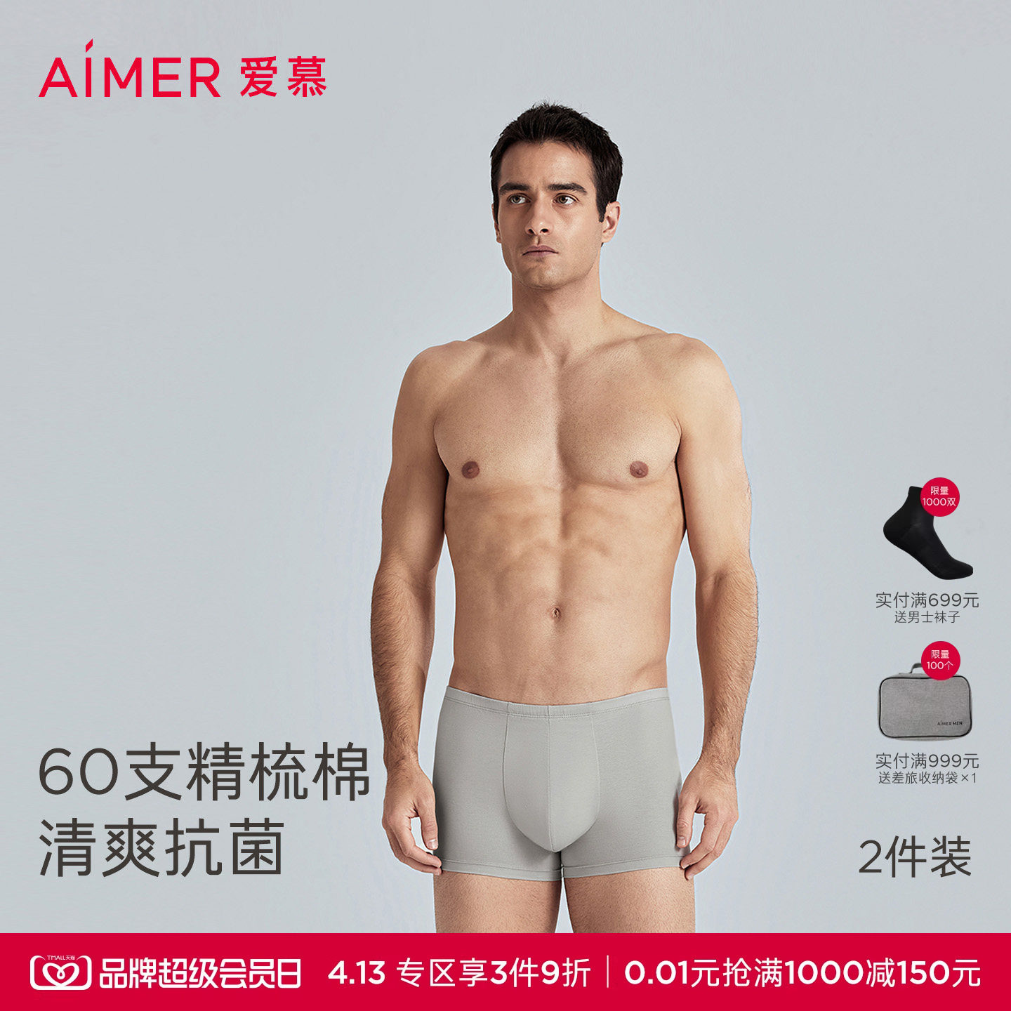 2件装|爱慕先生1号裤60支液氨棉抗菌内裤男士平角裤25年春夏透气