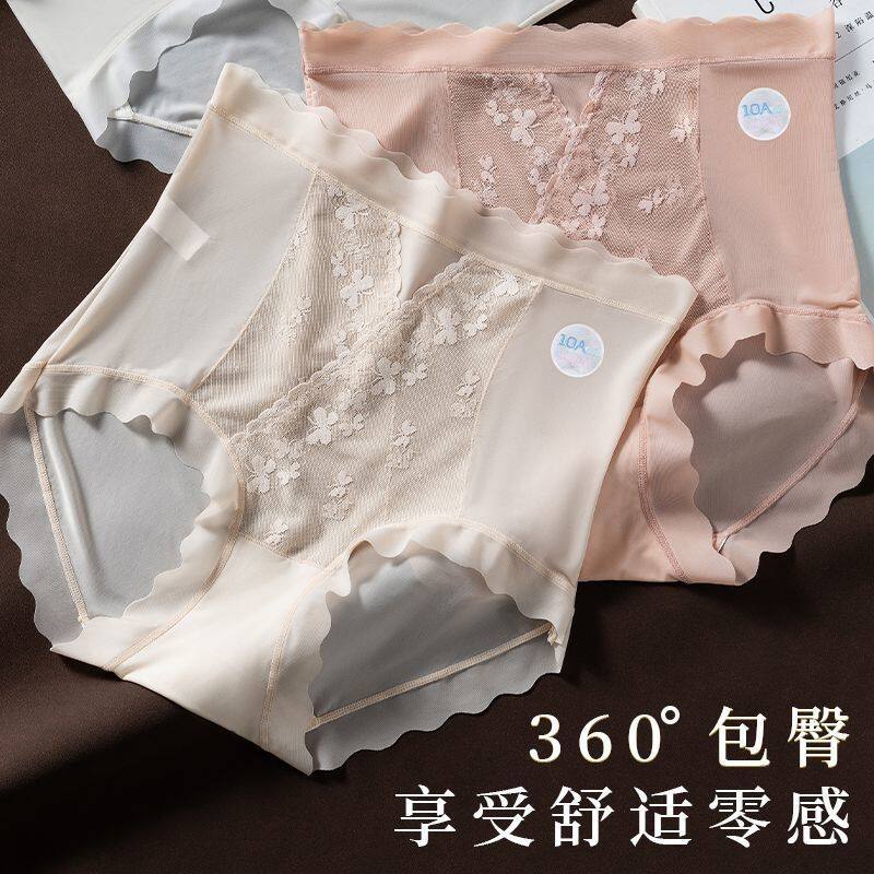 10A冰丝无痕内裤女高腰蕾丝提臀微加大码桑蚕丝抑菌裆三角裤收腹