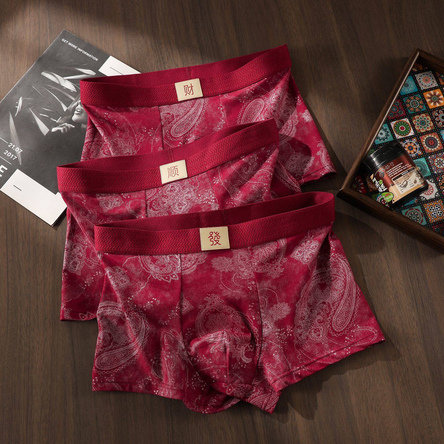 缇娅朵3条盒装男士大红色平角内裤桑蚕丝结婚本命年喜庆四角裤头
