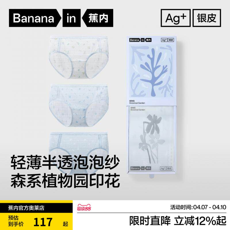 3件|蕉内银皮520C女士内裤泡泡纱抗菌蕾丝性感印花三角内裤25新款
