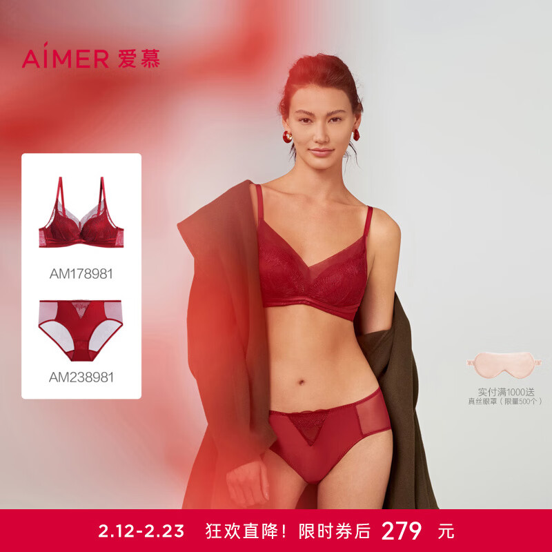 爱慕(Aimer)【本命年必备】烟花醉文胸内裤套装刺绣无钢圈中厚小胸显大聚拢 无钢圈-朱樱红DY202346 75B M 165(111-130斤)