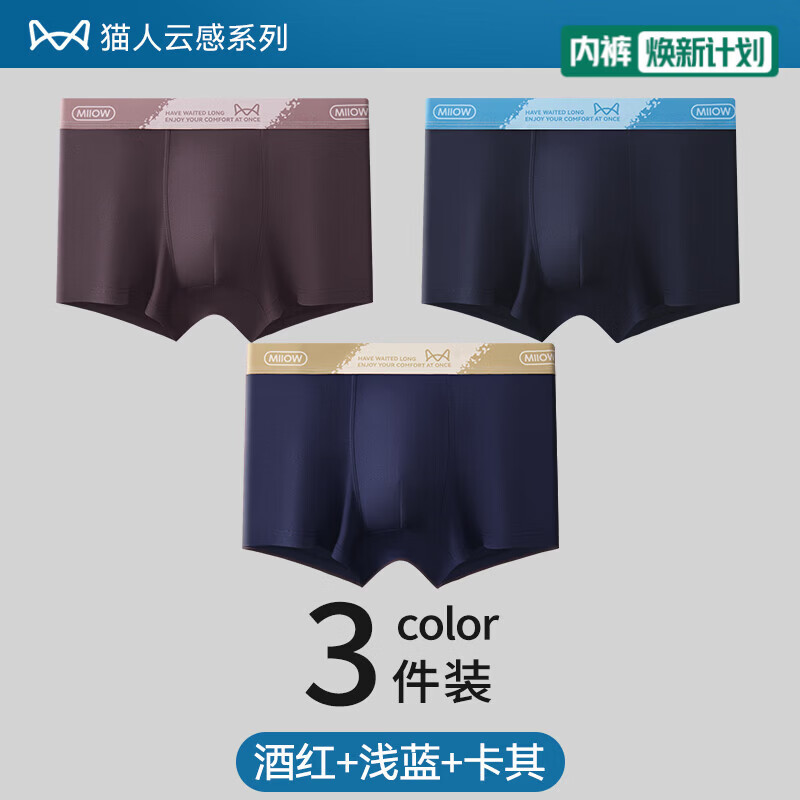 猫人(MiiOW)男士内裤生蚝素养护裆纯棉10A抗菌无痕裸感透气男生裤衩四角短裤 酒红+浅蓝+卡其 3条 3XL