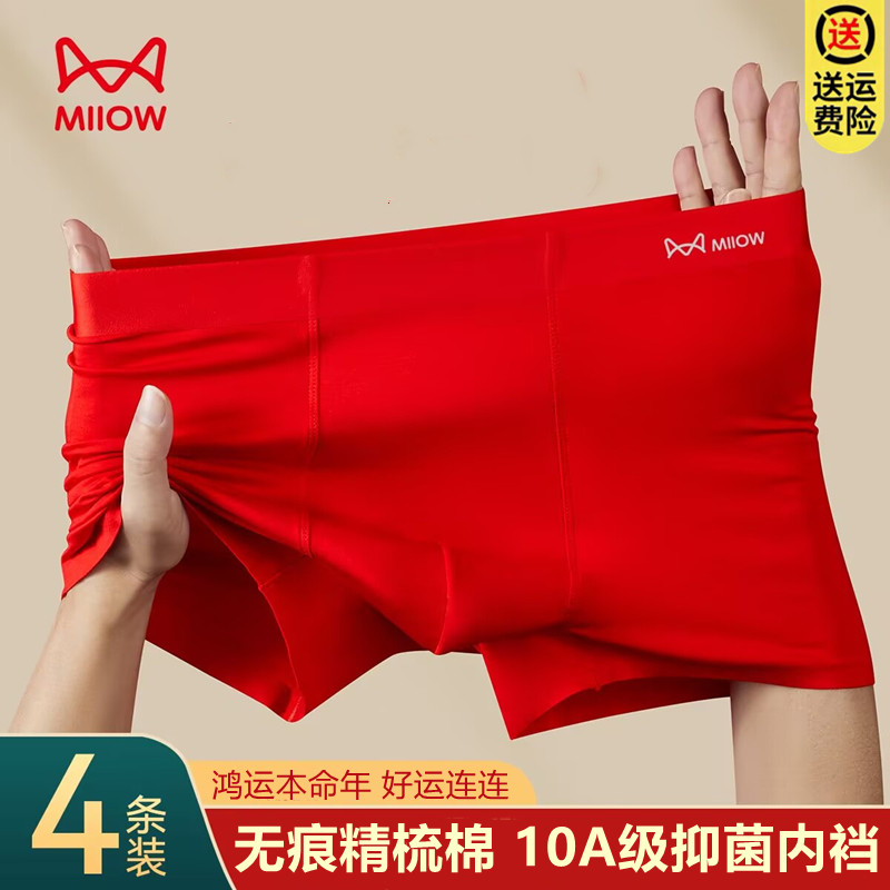 猫人男士内裤本命年红色无痕纯棉抗菌平角男结婚运动透气四角短裤