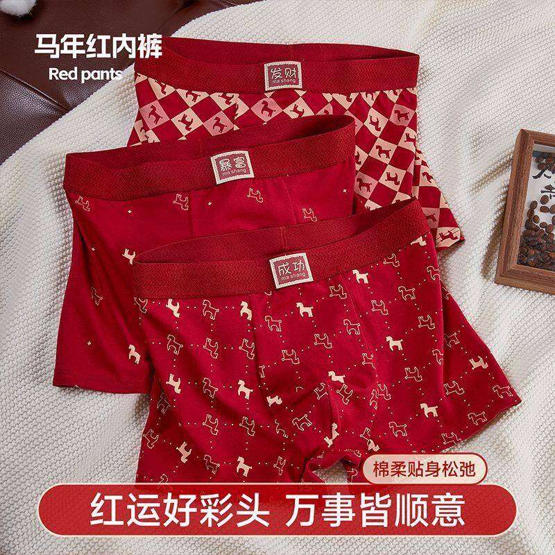 本命年男士内裤纯棉马年红色平角透气结婚喜庆舒适四角短裤裤衩