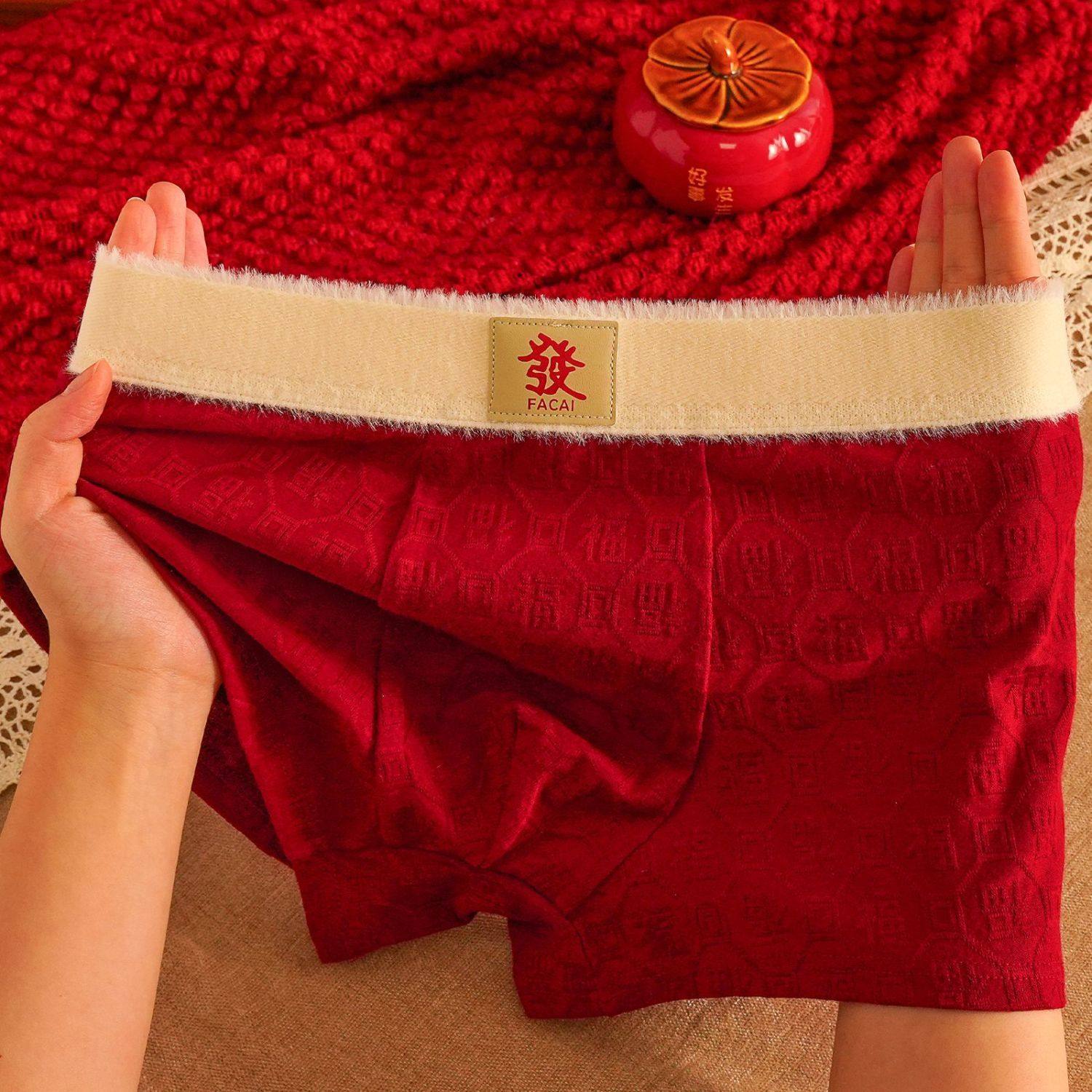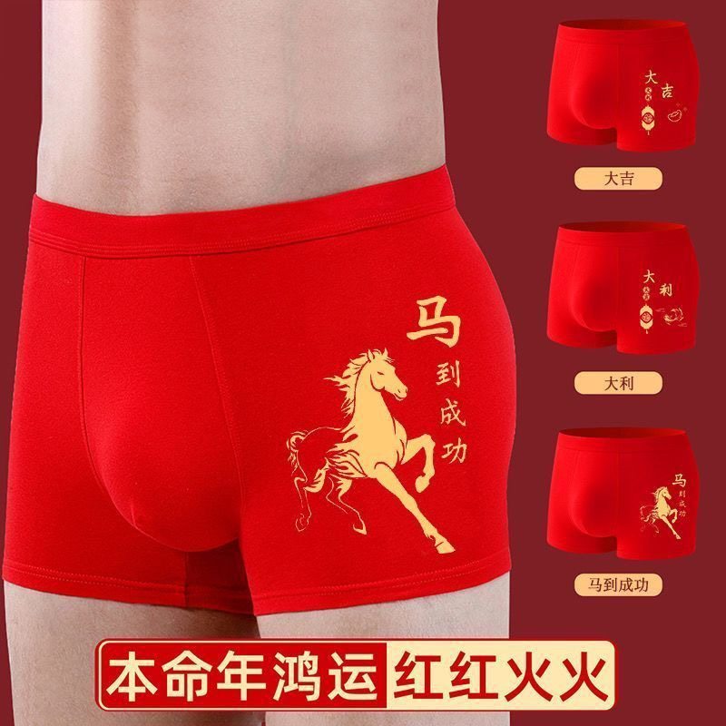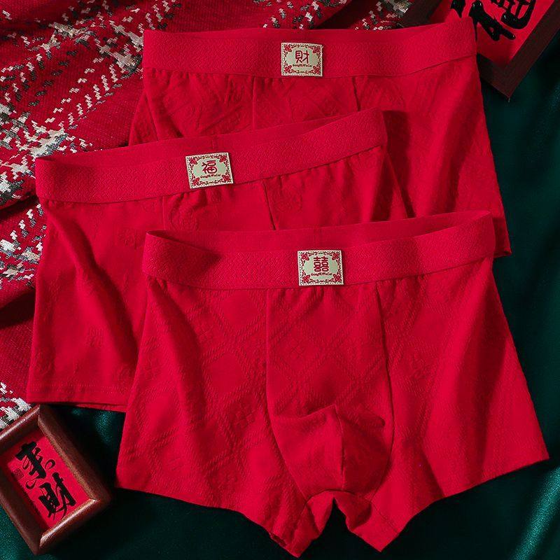 多条装礼盒新年内裤男士马上有钱大红平角裤祝福结婚中青年红裤衩