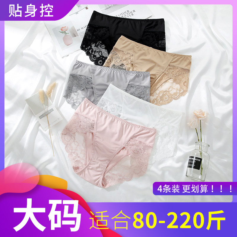 无痕牛奶丝内裤女200斤蕾丝裸感高开叉冰丝中腰大码胖mm黑色三角