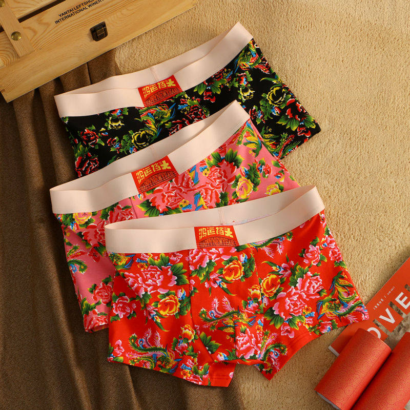 聚新程本命年红色男士内裤纯棉男生平角裤中腰四角裤短裤结婚喜事