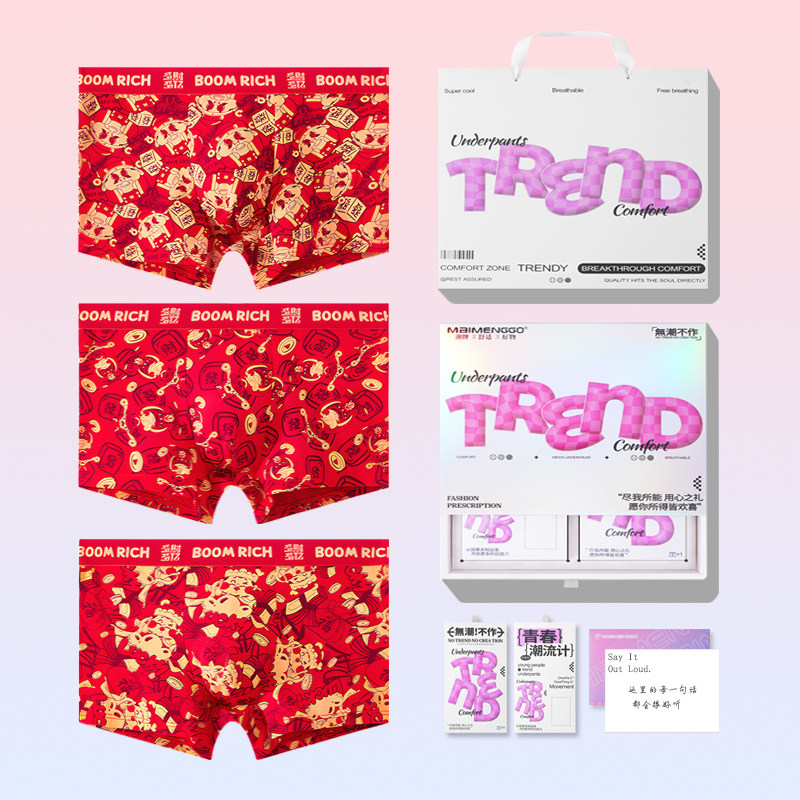 潮牌礼盒男士内裤纯棉2026本命年结婚红卡通抑菌透气中腰男四角裤