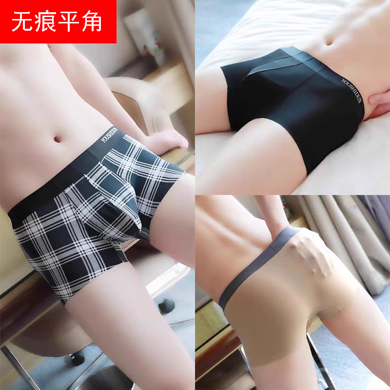 男士裆部加棉内裤薄款冰丝平角裤无痕透气囊袋透明四角短裤头裤衩