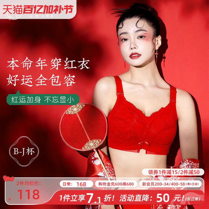 月色红色本命年内衣内裤套装女大胸显小文胸结婚全罩杯大码胸罩