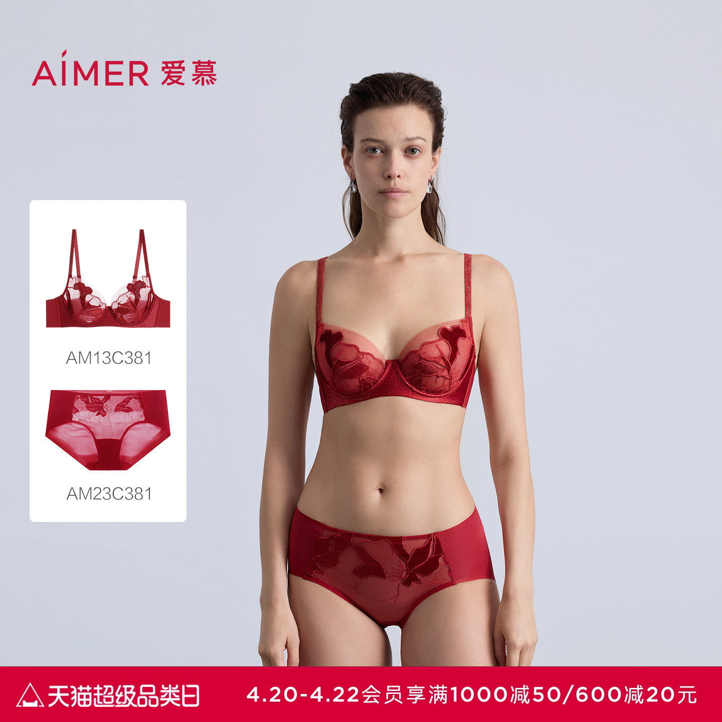 爱慕本命年红色内衣女轻薄杯大胸显小大罩杯文胸内裤套装