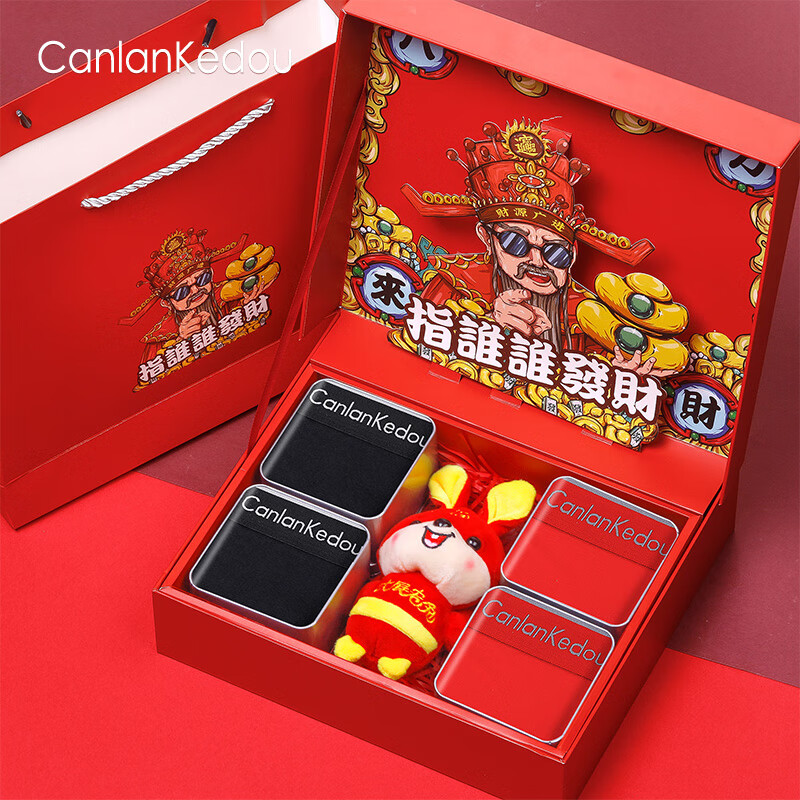 CanlanKedou男士内裤男本命年平角裤纯棉红色四角短裤头裤衩情人节礼物送男友 财神礼盒-黑色-黑色-红色-红色 各 1条 2XL (150-169斤)
