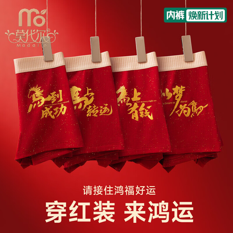 莫代尔本命年结婚大红男士内裤纯棉鸿运裤10A裆舒适透气平角裤衩男 四款各1条 2XL
