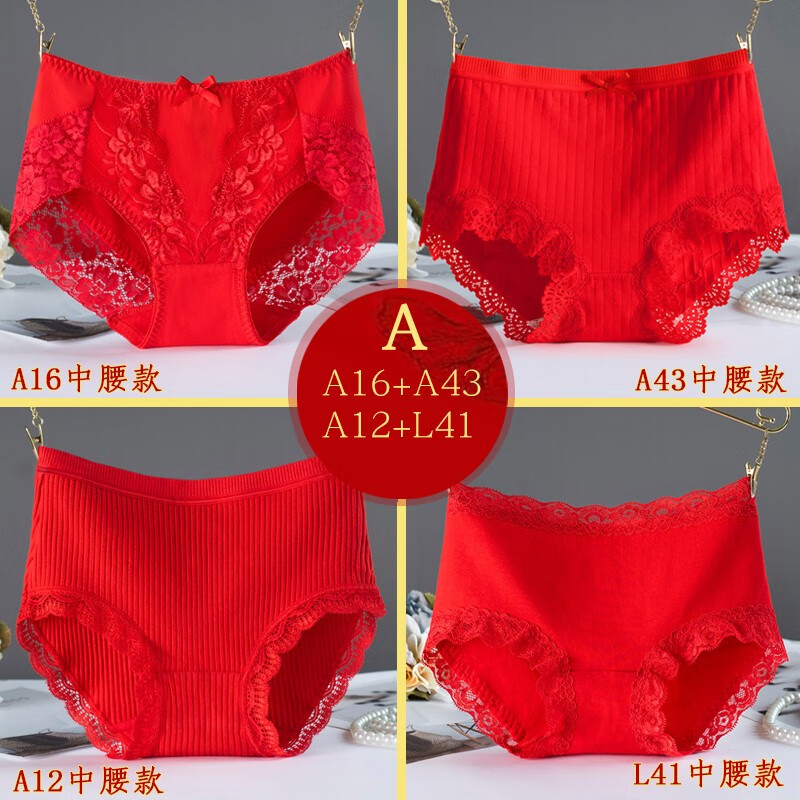 棉宜人【裤袜礼盒装】马年本命年红内裤女士纯棉裆高腰结婚新婚蕾丝无痕 4条A A16+A43+A12+L41送福袜1双+礼盒装 XL (建议120-140斤)