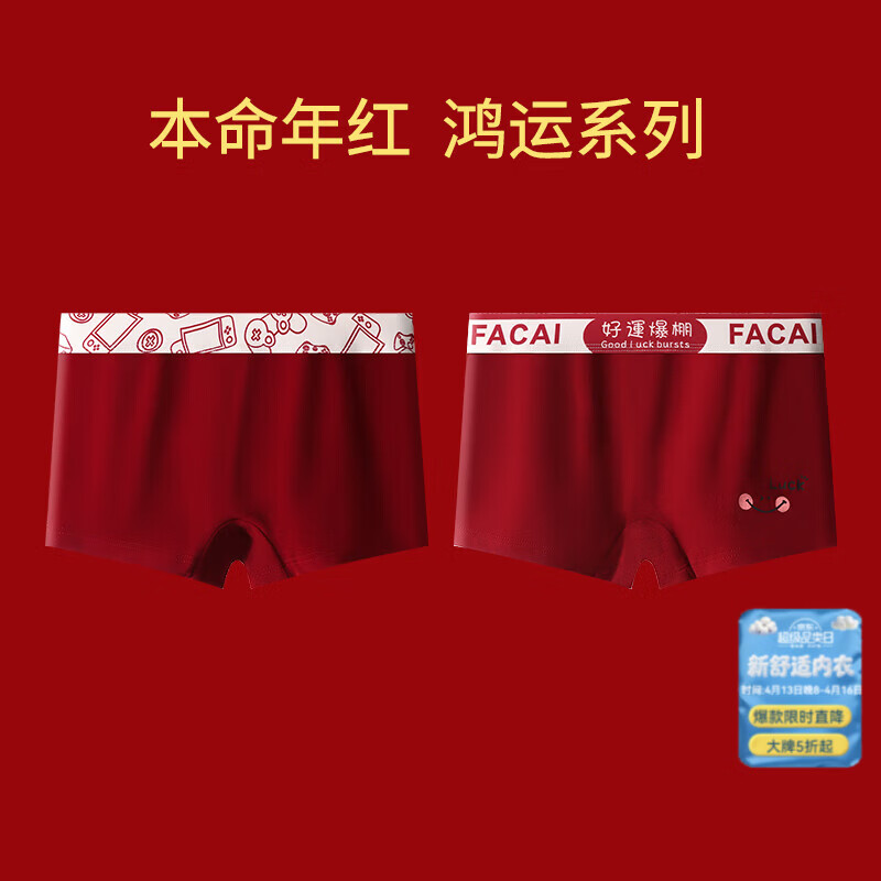 猫人男士内裤5A抗菌本命年红色四角裤鸿运结婚大码男式平角短裤衩 印花/大红袜[1条装+2双袜子] 4XL (建议165-180斤)