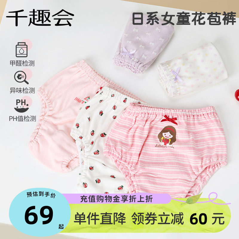 千趣会儿童春季女童纯棉细针罗纹轻薄透气不夹pp花苞内裤3条装