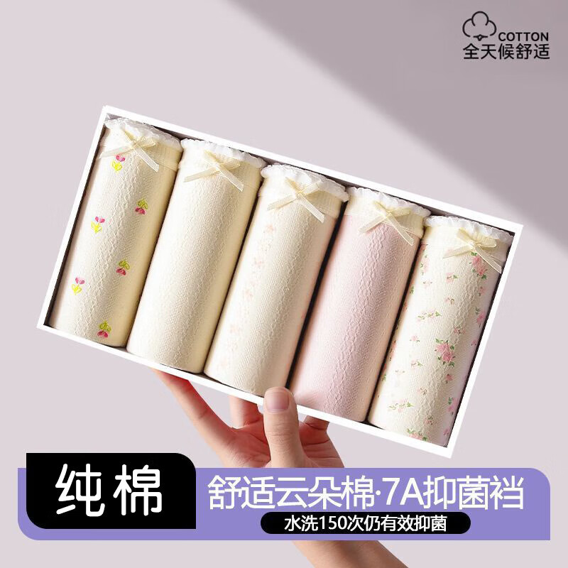 宜而爽100%纯棉花朵女士内裤7A抗菌新款全棉大码透气三角提臀式底裤女生 2黄小花+2黄大花+2黄色+1粉色 7条 L (95-120斤)