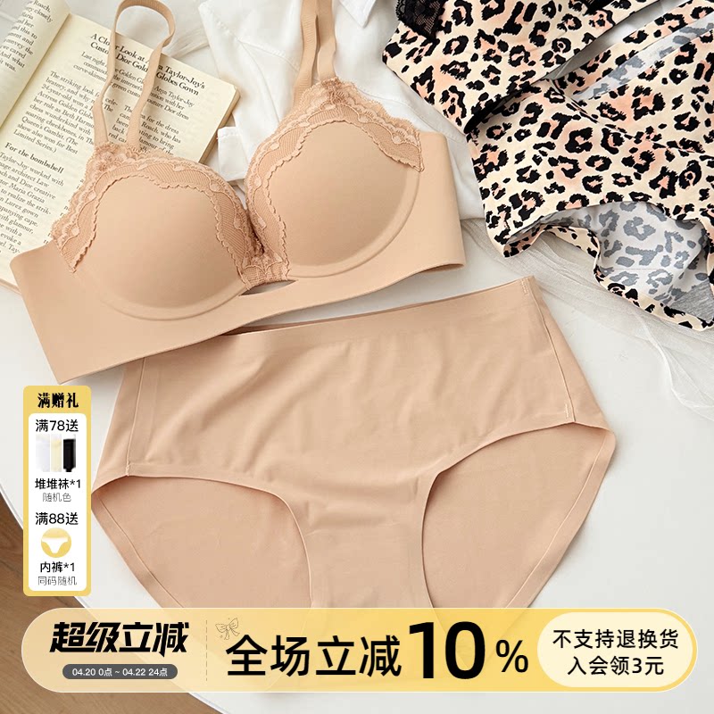 温柔裸感无痕文胸无钢圈细肩带蕾丝花边小胸显大聚拢内衣内裤套装