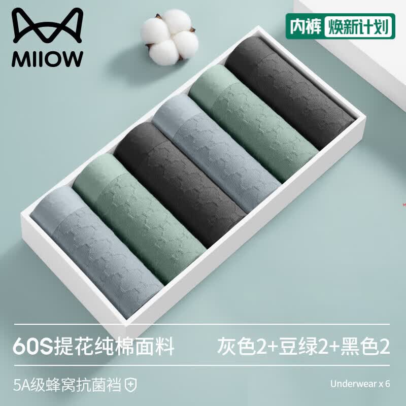 猫人无痕男士内裤男纯棉抗菌裆四角裤衩薄款大码男生平角运动短裤头 (灰色2+豆绿2+黑色2) 6条 3XL (建议155-180斤)