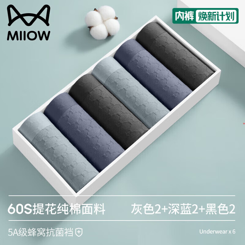 猫人无痕男士内裤纯棉抗菌四角短裤男生透气平角裤头男款底裤衩 黑色、宝蓝、深灰 3条 2XL 【建议体重130-150斤】
