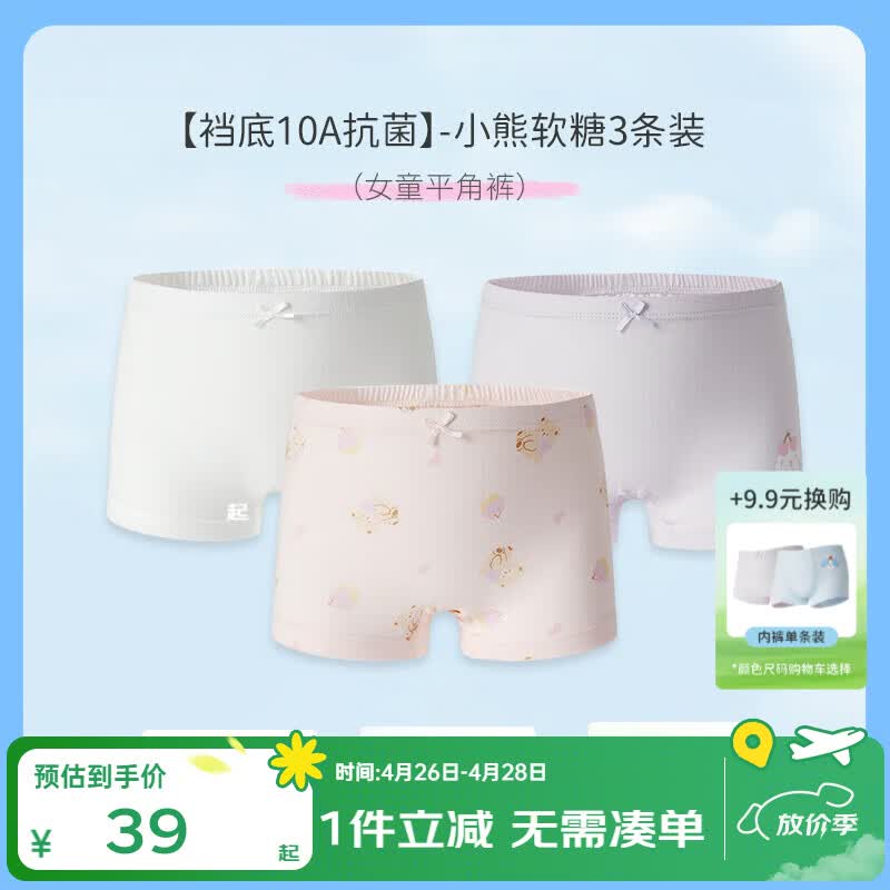 丽婴房(Les enphants)儿童内裤纯棉内裤男女童内裤四角不夹PP中大童平角裤抗菌三条装 【棉】小熊软糖-平角女童 【裆底10A抗菌】 3条 90 CM/2岁