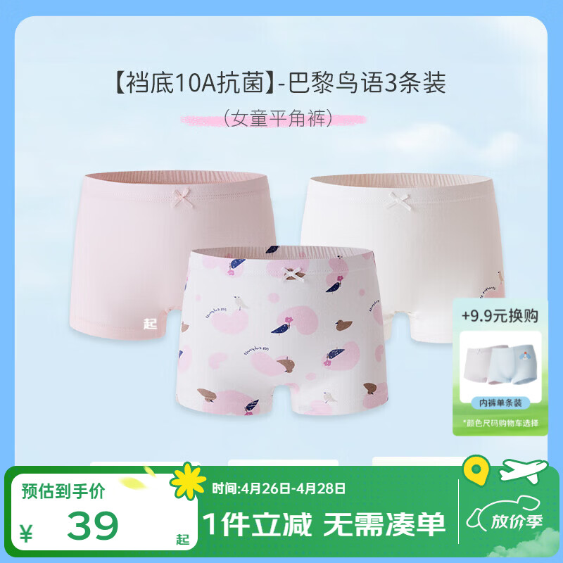 丽婴房(Les enphants)儿童内裤纯棉内裤男女童内裤四角不夹PP中大童平角裤抗菌三条装 【棉】巴黎鸟语-平角女童 【裆底10A抗菌】 3条 90 CM/2岁