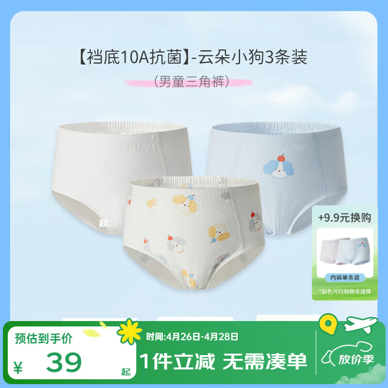 丽婴房(Les enphants)儿童内裤纯棉内裤男女童内裤四角不夹PP中大童平角裤抗菌三条装 【棉】云朵小狗-三角男童 【裆底10A抗菌】 3条 90 CM/2岁